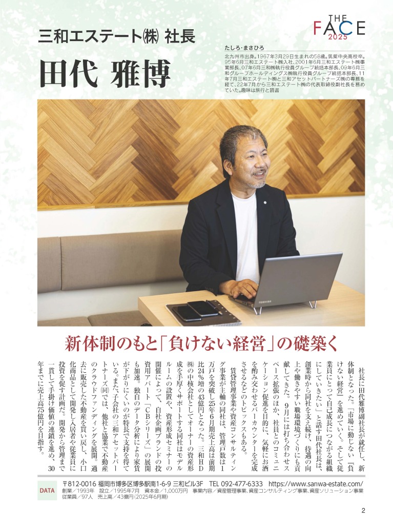 このたび、地域経済情報誌『ふくおか経済』(2025年11月号)にて、弊社代表取締役・田代雅博のインタビュー記事が掲載されました。